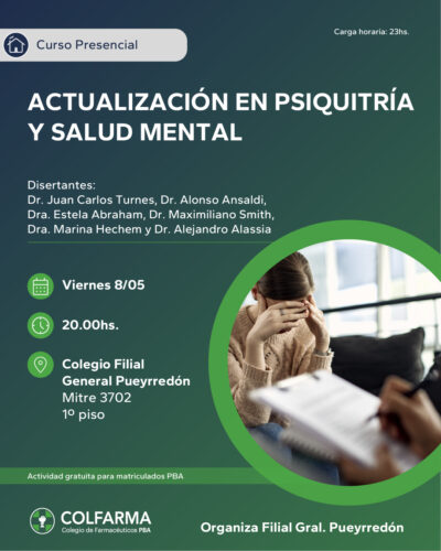 El CFPBA a través de su Departamento de Educación y Actualización Profesional, lanza una nueva capacitación PRESENCIAL. Organizada por la Filial de Gral. Pueyrredón: ACTUALIZACIÓN EN PSIQUITRIA Y SALUD MENTAL. Actividad Presencial y Gratuita para farmacéuticos matriculados en PBA.