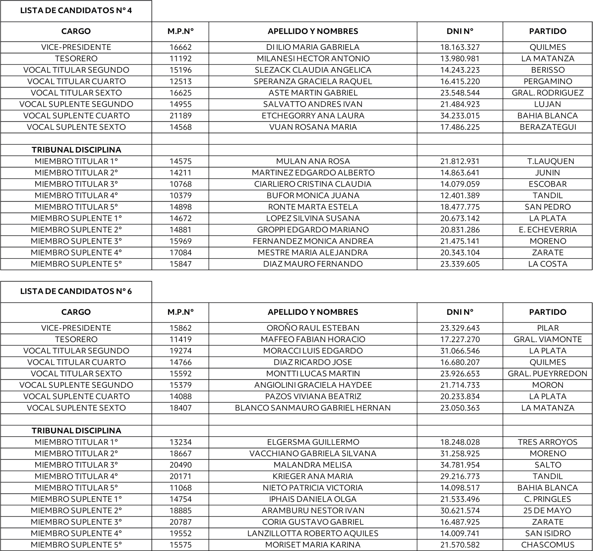 Con esta comunicación, el Consejo Directivo remite a los matriculados las listas presentadas a efectos de su conocimiento y abriendo el capítulo de las impugnaciones que pudiesen merecer los candidatos propuestos (Art.64).