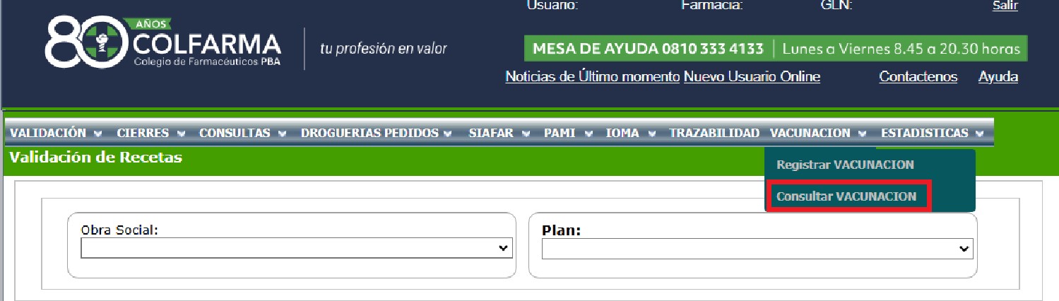 Además, hemos desarrollado la CONSULTA DE VACUNAS APLICADAS (ver imagen): ingresando al colfarmaonline.org.ar, haciendo clic en VACUNACIÓN / Consultar VACUNACIÓN.