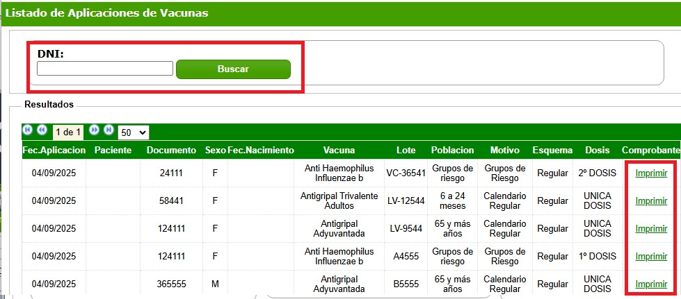 Allí deberá ingresar el DNI del paciente y el sistema listará todas las vacunas registradas en las farmacias para el mismo.